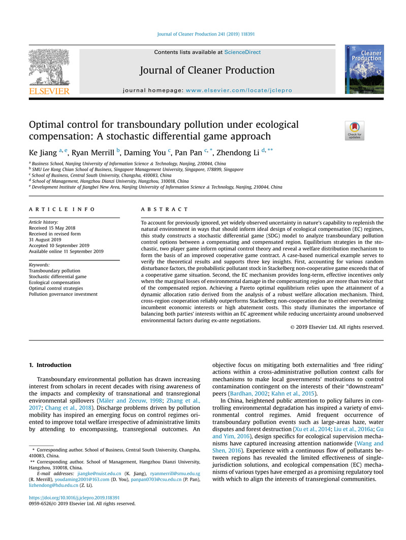 论文《Optimal control for transboundary pollution under ecological compensation: A stochastic differential game approach》发表于《Journal of Cleaner Production》。《Journal of Cleaner Production》最新影响因子为6.395,为中科院一区TOP期刊。在考虑随机因素干扰的情形下,通过建立一个随机微分对策模型,研究生态补偿机制下越界污染最优控制方案。运用动态规划方法,求得随机均衡策略,进而形成一个改进的合作博弈契约分配方案。研究表明,生态补偿机制只有在补偿地区环境损害边际损失超过被补偿地区两倍的情况下,才能提供长期、有效的激励;帕累托最优均衡的实现,依赖于稳健福利分配方案得出的动态分配比率的大小。