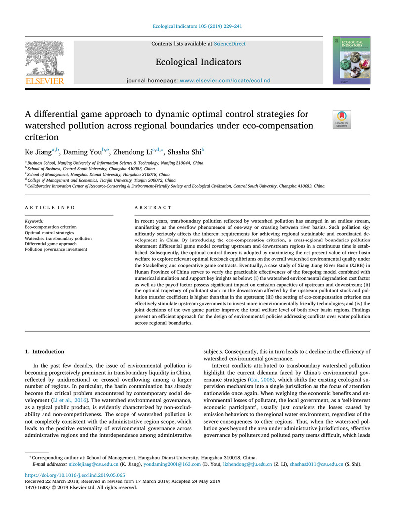 其中,论文《A differential game approach to dynamic optimal control strategies for watershed pollution across regional boundaries under eco-compensation criterion》发表于《Ecological Indicators》。《Ecological Indicators》最新影响因子为4.49,为JCR Q1 TOP期刊。近年来,流域污染问题层出不穷,表现为流域间单向或跨区域的溢出现象。研究通过引入流域生态补偿机制,建立覆盖流域上下游的跨区域污染控制博弈模型,分析不同博弈情形下上下游的反馈纳什均衡解。研究表明流域环境退化成本等因素对上下游减排水平具有重要且复杂的影响;相较于对自身的影响,上游污染物存量和污染转移系数的动态变化对下游污染物存量最优轨迹的影响更加明显;生态补偿标准的制定将更有效地激励流域上游政府加大环保技术等投入。