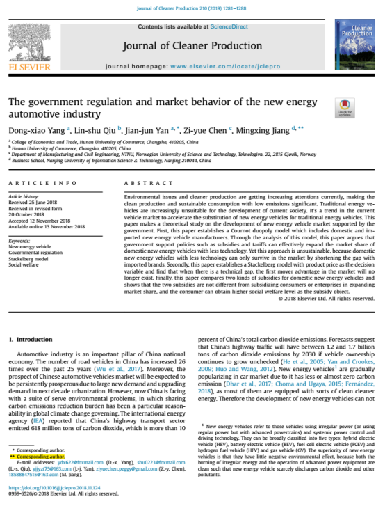 我院江民星博士(通讯作者)在SCI检索期刊《The government regulation and market behavior of the new energy automotive industry》发表于SCI期刊《Journal of Cleaner Production》((2019年第210期))。该期刊系中科院分区一区(Q1)期刊,最新影响因子为6.395。该论文通过理论模型分析了在面临外国品牌新能源汽车竞争形势下,扶植国内品牌新能源汽车发展的不同补贴与关税的政策效果。结果发现产量竞争条件下生产补贴在短期可增加国内品牌汽车市场份额,但在长期补贴效果消失,因而生产补贴并不持续;价格竞争下先动者不存在优势,而后动者可获得更多市场份额。另外,本文还讨论了针对国内企业和消费者两种补贴政策效果,发现两者在产品市场份额及消费者剩余表现无差异,但消费者补贴增加了企业利润,并且它比生产者补贴作用更有效,因为它可避免企业欺诈的补贴行为。