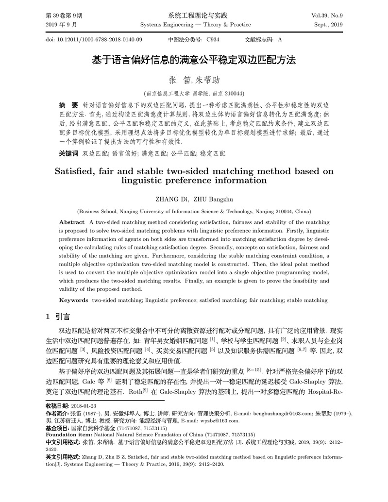 近日,我院张笛博士(第一作者)的论文《基于语言偏好信息的满意公平稳定双边匹配方法》发表于学科权威期刊《系统工程理论与实践》(2019年第9期)。
