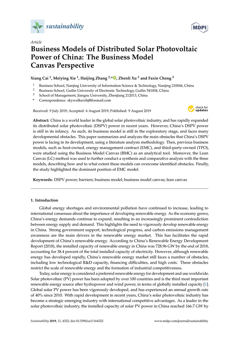 我院蔡翔教授在SSCI检索期刊《Sustainability》(2019)发表论文《Business Models of Distributed Solar Photovoltaic Power of China: The Business Model Canvas Perspective》。