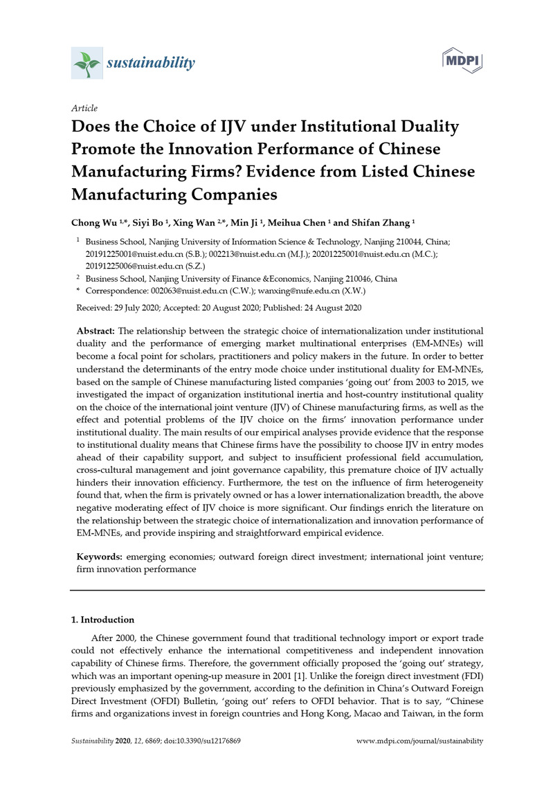 论文《Does the Choice of IJV under Institutional Duality Promote the Innovation Performance of Chinese Manufacturing Firms?Evidence from Listed Chinese Manufacturing Companies》发表于SSCI检索期刊《Sustainability》。(论文链接:https://www.mdpi.com/2071-1050/12/17/6869)