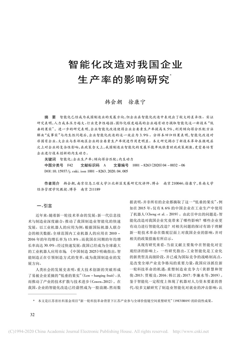 近期,我院韩会朝博士以第一作者在《南京社会科学》上发表学术论文“智能化改造对我国企业生产率的影响研究”(2020年第4期)。论文指出,智能化已经成为我国制造业的发展方向,但企业在智能化改造中表现出了较大的差异性,人力成本压力越大、行业竞争性越强、国际化程度越高的企业越有动力摘取智能化这一新技术“低垂的果实”。企业智能化改造对非国有企业、大企业与东部地区企业的全要素生产率促进作用更明显。研究指出我国制造业智能化的发展需要培育企业进行技术创新的内生动力。