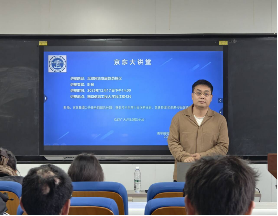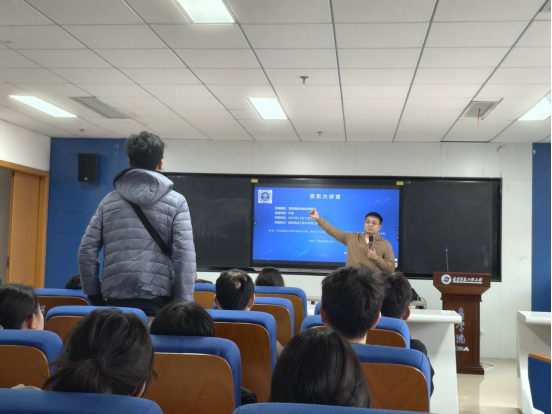 2025年12月17日,商学院在阅江楼426成功举办京东大讲堂活动。此次讲座特邀京东集团公共事业部副总经理叶扬担任主讲嘉宾。讲座由何正全副院长主持,供应链管理系教师、2023级、2024级、2025级京东实验班全体学生和2025级各班新生参加了此次讲座。